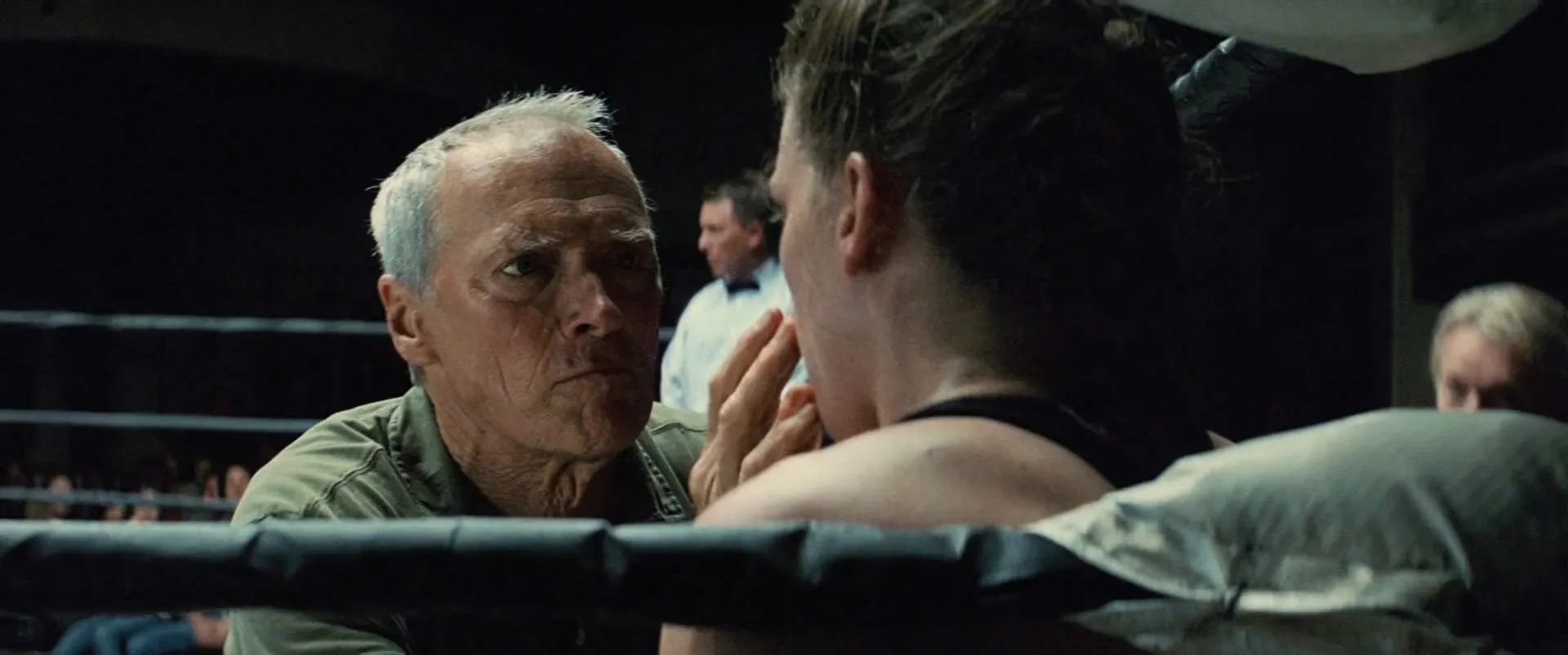 Cast: Clint Eastwood as Frankie Dunn, Hilary Swank as Maggie Fitzgerald, Morgan Freeman as Eddie 'Scrap-Iron' Dupris, Jay Baruchel as Danger Barch, Mike Colter as Big Willie Little, Lucia Rijker as Billie 'The Blue Bear', Brían F. O'Byrne as Father Horvak, Anthony Mackie as Shawrelle Berry, Margo Martindale as Earline Fitzgerald, Riki Lindhome as Mardell Fitzgerald, Michael Peña as Omar, Benito Martinez as Billie's Manager, Bruce MacVittie as Mickey Mack, David Powledge as Counterman at Diner, Joe D'Angerio as Cut Man, Marcus Chait as J.D. Fitzgerald, Tom McCleister as Lawyer, Erica Grant as Nurse, Naveen as Pakistani, Morgan Eastwood as Little Girl in Truck, Jamison Yang as Paramedic, Susan Krebs as Rehab Nurse, V.J. Foster as Ref #3, Steven M. Porter as Ref #6, Ming Lo as Rehab Doctor, Miguel Pérez as Restaurant Owner, Jim Cantafio as Ring Doctor, Ted Grossman as Ring Doctor, Ned Eisenberg as Sally Mendoza, Marco Rodríguez as Second at Vegas Fight, Mark Thomason as Radio Commentator, Brian T. Finney as Irish Fan, Spice Williams-Crosby as Irish Fan, Kim Strauss as Irish Fan, Kirsten Berman as Irish Fan, Jimmy Alioto as Las Vegas Fight Fan (uncredited), Jason Williams as Las Vegas Fight Fan (uncredited), Nina Avetisova as VIP Girl (uncredited), Michael Bentt as Boxer (uncredited), Bruce Gerard Brown Jr. as Boxer (uncredited), McKay Stewart as Sparring Boxer (uncredited), Jude Ciccolella as Hogan (uncredited), Kimberly Estrada as Perez (uncredited), Sean LoGrasso as Fight Fan (uncredited), Maher McClung as Irish Fan (uncredited), Sean O'Kane as Additional Voices (voice) (uncredited), Vladimir Rajčić as Yugoslavian Judge (uncredited), Marty Sammon as Ref #5, Robert Maron as Irish Fan #4, Rosine 'Ace' Hatem as Maggie's First Opponent (uncredited), Boni Yanagisawa as Maggie's Third Opponent (uncredited), Christina Cox as Maggie's Fourth Opponent (uncredited), Mimi Lesseos as Billie's Opponent (uncredited), Bridgett Riley as Maggie's Second Opponent (uncredited)